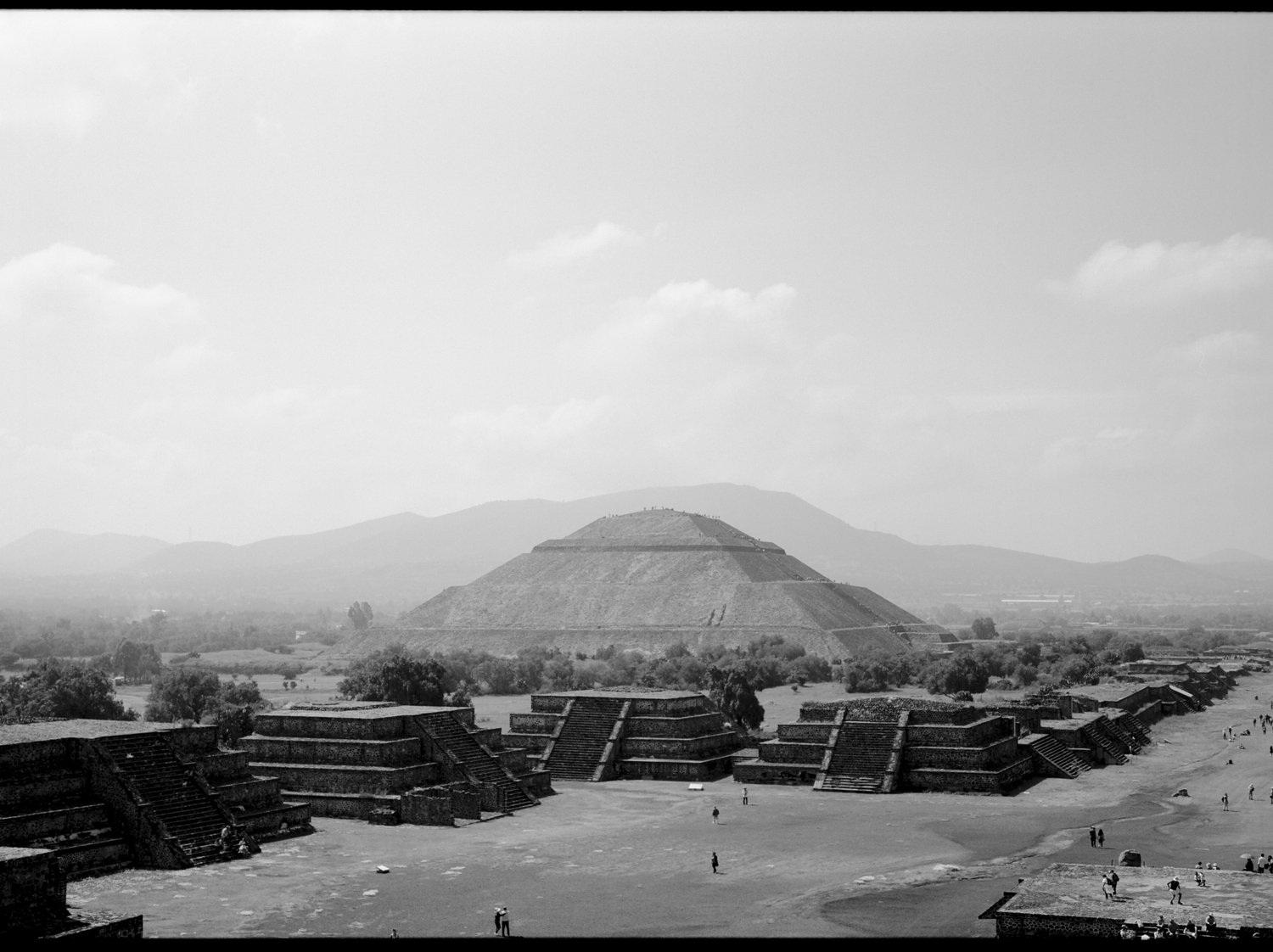 It is home to three pyramids - those of the Sun, the Moon, and the Feathered Serpent. The steps of these structures are made of lava, and their silhouettes mirror the Cerro Gordo mountain range in the distance. Everything is intentional, nothing is random here. The light turns blue and you are invited to ascend with hands and feet, these manmade volcanoes: the only way to find yourself at the top. Not for the faint of heart, someone says. Well, none of life is, you think. Pyramid as metaphor. Too easy, you think. Pyramid as pyramid. Sufficient in and of itself, if anything ever was.